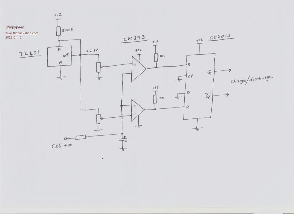 The next part consists of a stable 2.5 volt regulator using a TL431, and two potentiometers to set the max charging voltage and minimum discharge voltage. A multimeter direct onto the pot would be used to set the required voltages.