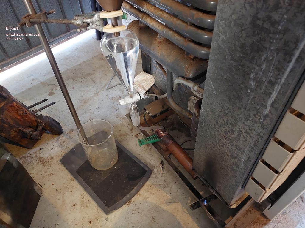 Now for the flow rate and with 20 drips it amounts to 0.5ml and just now it took 45 seconds to do the 20. I have the chamber full and with the drip rate getting a slight over flow which improves the burn size by a huge factor and finally the fridge is starting up just off the moonshine