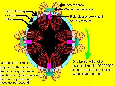 so every rev. counts as 4 times quicker cutting time. Note : it is the number of lines of force actually cut per second,. so it boils down to the number of turns in the coil and the speed of the rotor. To keep your generator within the speed of sound it should have a generous magnetic field.