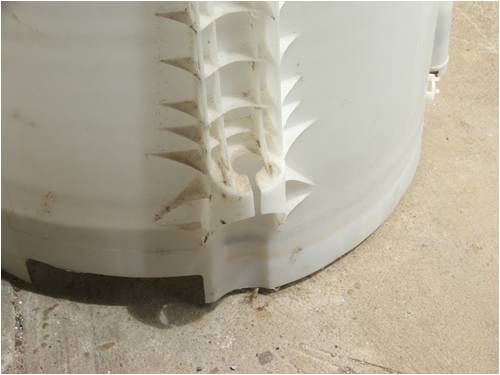 The outer tub can be fixed to the ground to prevent it being knocked over when feeding by driving steel pegs through the three lugs on the outside which were originally used to suspend it in the machine. The inner metal and plastic tub has water filled chambers top and bottom to help stabilize it when it spins – the top one can be drilled to drain it to make it lighter and less top heavy.