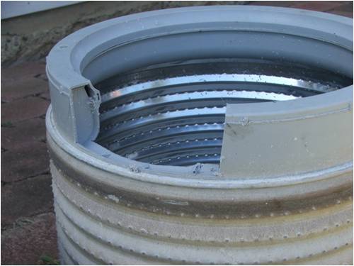 Then I made a stand from the inner perforated tub by cutting a section from its rim to clear the pump housing and to enable the drain hose to be re-fitted - I used a jig-saw for this but watch out for the water which comes out!