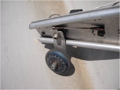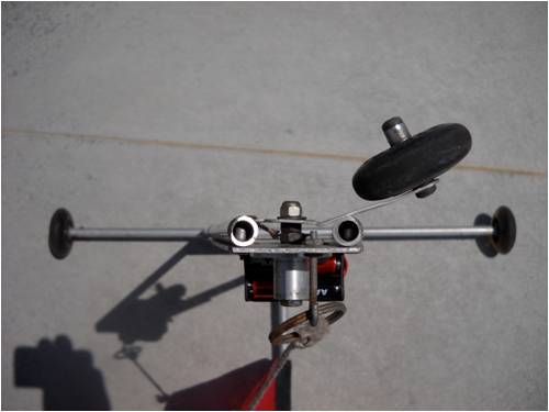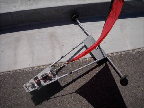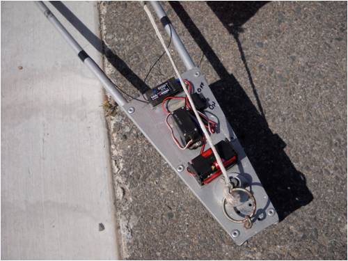 The two front wheels (inline skate wheels with dandy sealed ball bearings) are on the same axle and the rear wheel is hooked to a single "servo" motor through a linkage under the craft. I design, build and fly R/C gliders for fun and games too. I use a 2.4 GHz transmitter, which is "paired" to a receiver out of one of my planes. All the electronics are mounted to the aluminum deck using double-sided tape. The body of the craft is manufactured out of tempered aluminum plate pop-riveted to aluminum tubes (similar to the ones I use in my windmill blades). The picture above shows the flight battery (power source), 2.4 GHz receiver, on-off switch and direction control servo (which hooks to the rear wheel via a linkage under the rear deck plate).