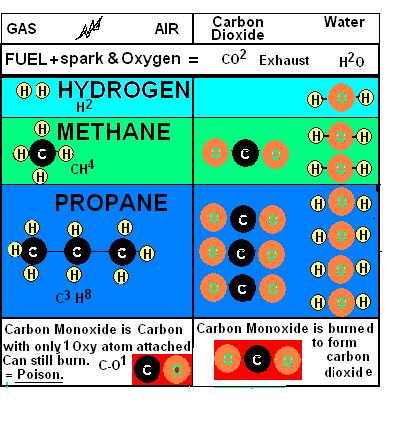 You will notice that Methane(natural gas) contains 1 carbon atom and four hydrogen atoms. Wood, Gas and Oil are the natural fuels of earth, all contain carbon and hydrogen, all must have oxygen to burn and all create (carbon monoxide,carbon dioxide) and Water when burned. The one exception is hydrogen Gas which only forms Water.