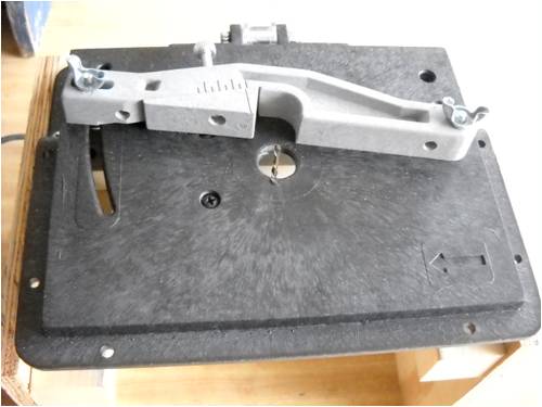 Here's a shot of the Dremel tool mounted to the router table. It just clamps in with a couple special clamps that you hand-tighten in place and it's made to fit the Dremel tool EXACTLY. There's a depth-of-feed adjustment and a lock-down thing so you can choose the depth of the cut you want and lock that dimension into place whilst you whittle away topside.
