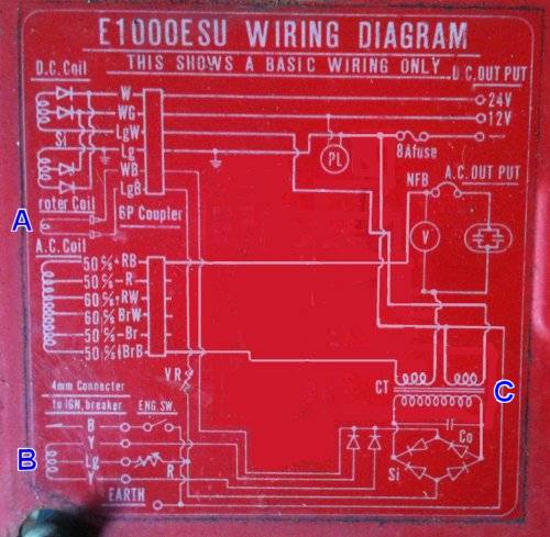 Circuit diagram, I edited it a bit to remove the voltage select plugs. A is the armature coil, B is the exciter coil in the little motor, C is the regulating transformer, its really very simple.
