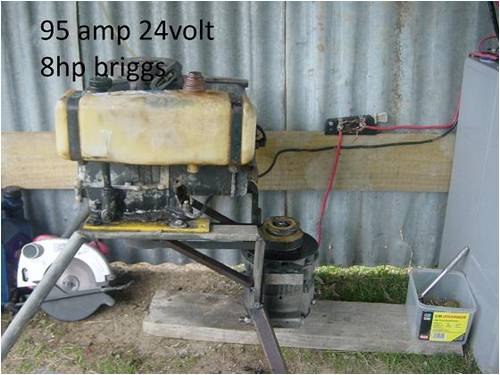 Hi i have one of these the alternator is a caterpillar 24 volt 95 amp it was on an old 8 hp briggs until it died of old age now its on a kola ten hp electric start motor and when my bank is down it needs all ten hp to run the alternator (works real hard) here is a picture of the old motor setup not tidy but it worked.