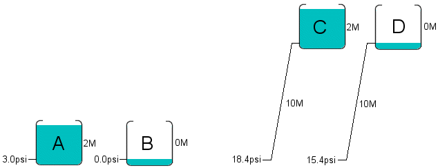 If the tank feeds water to a house or shed, I was wondering if measuring the water pressure at the tap would give a accurate indication of tank level. See the diagram below. The figures I found on the net indicate 32 feet or 9.7 meters for 15 PSI ( 1 atmosphere ). Keeping it metric, thats 650mm ( 0.65M ) per PSI. So with a pressure guage at the bottom of a tank that holds 2 meters of water, we get a reading of 3psi when full, and 0psi when empty. If we lift the tank 10 meters up, we get 18.4psi full and 15.4 psi empty. How far away the tank is on the horizontal, or the diameter of the pipe, dont come into play, only vertical height will affect static pressure.