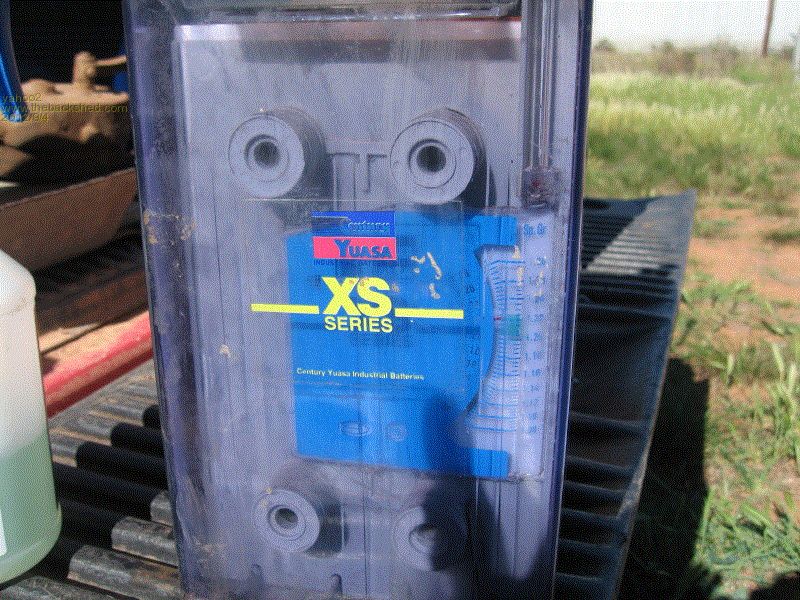 This first one is a battery originally designed for backup power. It is kept fully charged for months on end waiting for that one day when it is needed. The first thing you notice is the massive amount of fluid that it holds in relation to the area of the plates. reason???it's able to use a lower acid concentration to reduce oxidisation (essentially rust) but still have enough acid to carry out the reaction. made for low power delivery over extended periods of time. Checking the specific gravity shows a charged level of 1.225 - 1.230. This is close to what I would expect for this use. There is a specific gravity meter (broken)and thermometer built into the case, handy for quickly looking for a fault