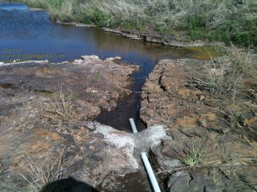 Made some improvements to the ram. Chipped away at a natural fault line in the creek bed to make a little inlet pond thats separate from the main creek flow. Concreted in a dam with a length of 50mm PVC pipe at the bottom. The 40mm pvc fits up this, and fitted a slotted strainer, the slots are facing down so it cant suck air.