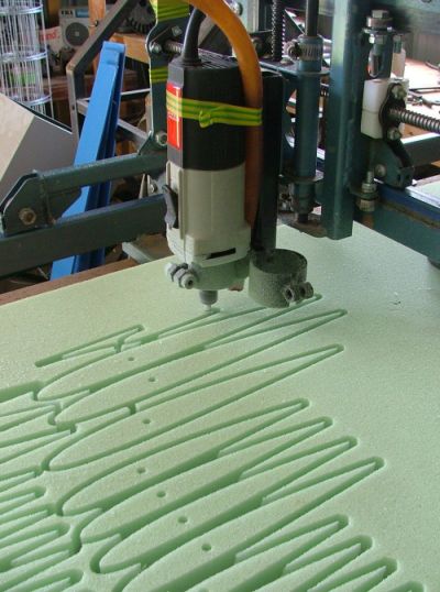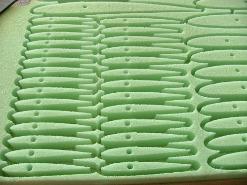 Well its good to get a few days off. I finally got around to making the foam ribs for Trev. These are to make the plug for a 2 meter blade, and use profle NACA2410. I entered the figures into the old faithfull Warlock blade calculator and used the results to draw up the rib sections in Autocad. The blade calculator gave tips of only 70mm chord length, so these were scaled up to 100mm, and the points near the hub were scalled down to 300mm, as these were almost 500mm. Once I had all the profiles scaled to size, I nested them together to fit a piece of 25mm PVC foam Trev gave me for the job. To save material and machine time, I used something we call bridge cut, where the parts are joined together with little bridges. This means the router can stay down for longer. The cad work took about 2 hours, and the routing on the machine took about 1 hour.