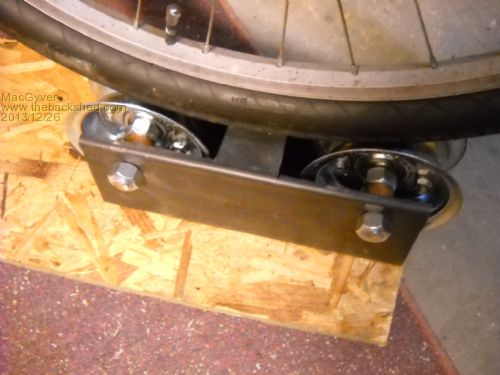 The rear wheel of the bicyce is cradled between the two free-wheeling wheelbarrow hubs and away we go. The rear thingy is a piece of 4" mild steel welded tubing. I cut out two "U" shaped slots and attached two metal hubs taken from wheelbarrow wheels. They were $10 each with the tubes and tires; anybody need tubes and tires? Me neither.