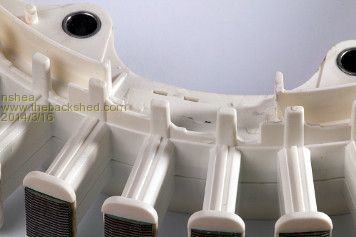 This PET (polybutylene terephthalate) or glass filled polypropylene (I'm not sure which) is exceedingly tough, and it took some shaving with a Stanley knife to get a smooth surface. The reason for removing the terminal blocks is to make room for the stator plate.