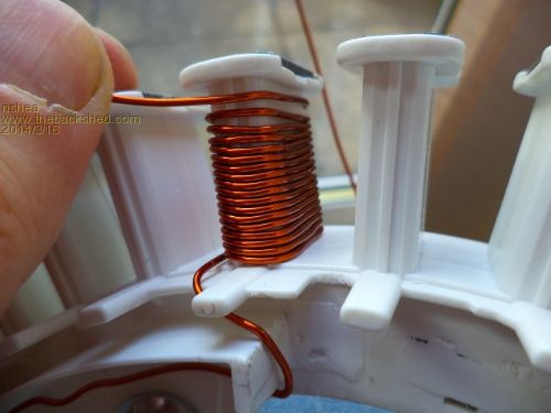 When using 1mm guage wire, there is only room for two layers per pole. The factory winding, (which used a narrower gauge), had four layers per pole. But the mass of copper in the new winding should give similar, if not greater inductance when using neodymium magnets
