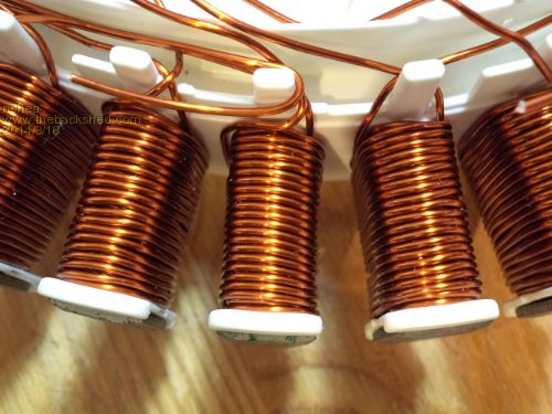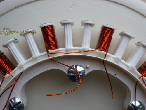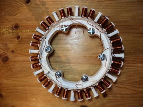 The stator was wound one phase at a time, with six pole pairs making up each phase. Each pole has forty one turns of wire, and each coil pair takes about an hour to complete.