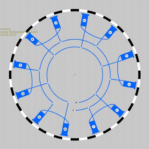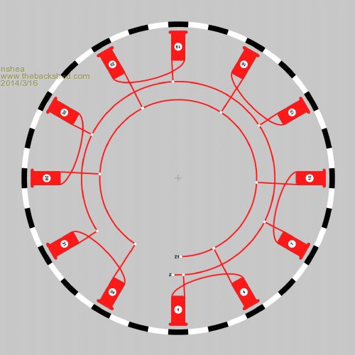 I will be winding the stator for three phase power as instructed by Glenn. Here are some pretty diagrams I did in Adobe Illustrator...