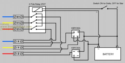 And a relay switch will select star or delta winding. The reference for this circuit diagram was sourced from Hugh Piggot's axial windmill pdf paper...