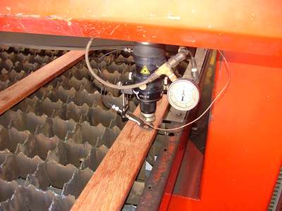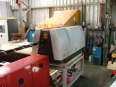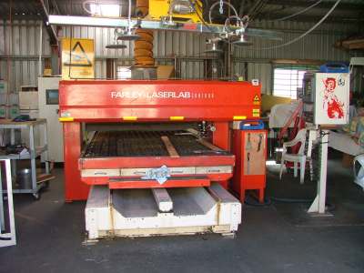 Its a old Farley laser cutter, Australian made with a Rofin Slab laser. The slab lasers have a very clean beam and focus down to a fine cut. The table is driven by a old 486 based controller that runs a Unix operating system. Its not a bad old thing, needs a little care and attention, but will do just fine. My job involves CAD design, nesting and NC, operating the machine and repairs ( laser cutters do break down often ).
