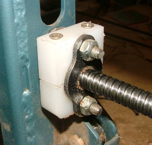 For nuts I used a pieces of HDPE ( HDPE or Nylon can be bought cheap as kitchen cutting boards, the thick 10 or 12mm ones. Has a waxy feel to it. ). They were split and then melted onto a heated length of thread, cleaned up and drilled to take adjustment screws, these adjust the slop out of the nut. I'll go into the exact details on how they are made later, but the result is a smooth running HDPE nut with no backlash. Easy to make and replace, keeps with the plan of a machine with easily replaced wear parts.