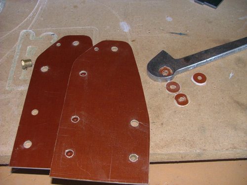 Once I got the parts home, I used the side plates as templates to cut some 3mm fibreboard. The laser can cut this stuff, but its messy and leaves a carbon rich burnt edge. As this fibreboard was to be used as a insulator, I didn't want any carbon edges, so it was easier to cut the fibreboard manually. I also used a hole saw to make up some washers.