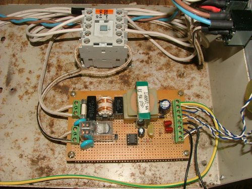 Below is the circuit, I need to draw it up. It uses a NE555 as the timer. I had to add a lot of spike protection, the back emf from the contactor and transformer was causing false triggering. I still need to tidy up the wires with cable ties.