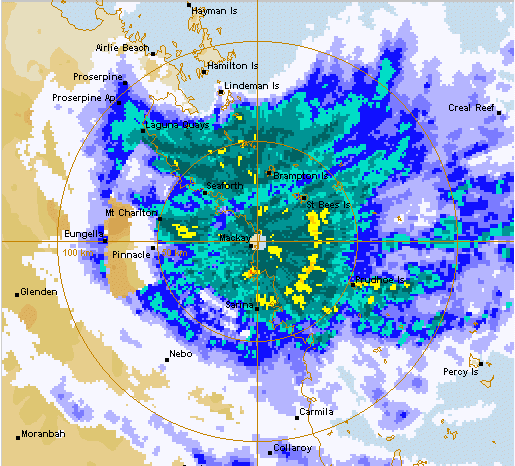 This is the Mackay rain radar at 2am. Rain was heavy at times, I think there was about 200 to 300mm in my area. The eye was crossing the coast at Airlie Beach.