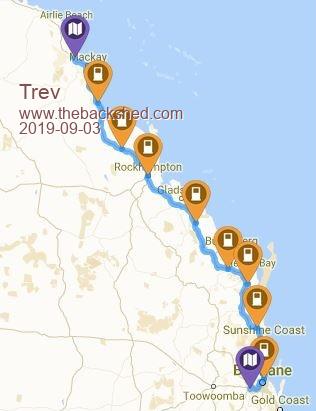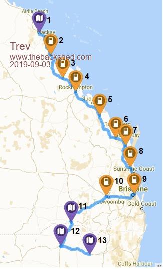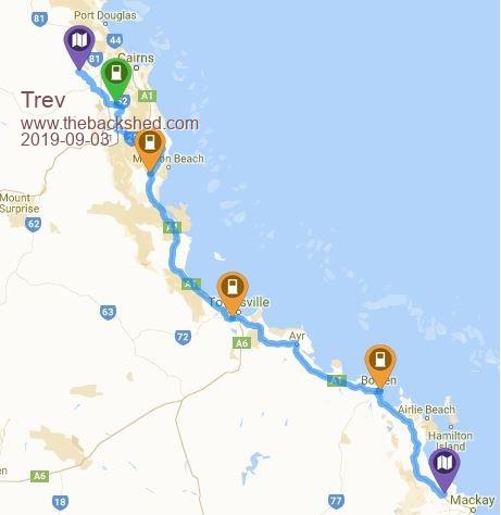 Charged at Bowen, Townsville, Tully, Cairns, Yungaburra Info Centre, Atherton Motel (x 2), back to Tully, Townsville, Bowen and home.
