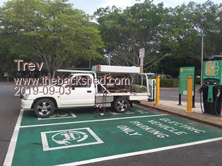 I have done this trek before without needing the generator, but I had bought a new petrol DC generator system (3 at 60v) and wanted to try it out. If it failed, it was ok, because I didn't need it anyway. It did fail. Parts came undone and other parts broke off. Oil leaks, which made a big mess. For a stand-alone solar back-up generator they will be ok, but not for range extending / hybrid EV application. I was glad I had them though, they did get me out of a bind at Cooroy. Cooroy charge station did not work and Chargefox couldn't fix it. So I started the generators to move on. Without the gennies, means a tow truck. It is not very often I have to share a charge point with other EV's. A BMW I3 came in to charge. He used the fast DC charger which was still working. I need the Type 2 which was not working.