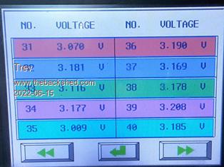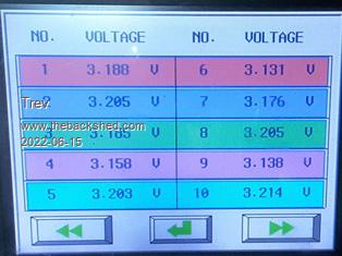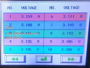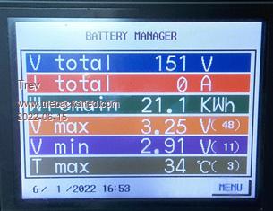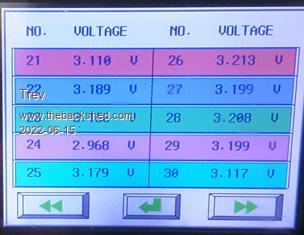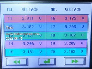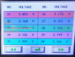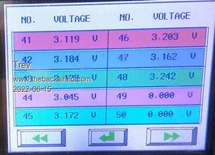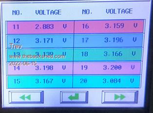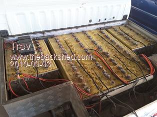 On the first of June, I did the usual drive to Mackay round trip. Did 102.8km using 21.1kW by the screen. I also photo'd the single cell voltages at rest after the trip. Then I connected up to the solar for recharge and measured 163Ah going back in.