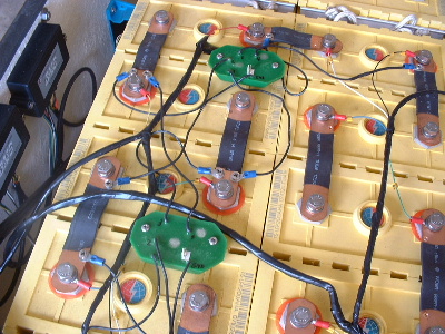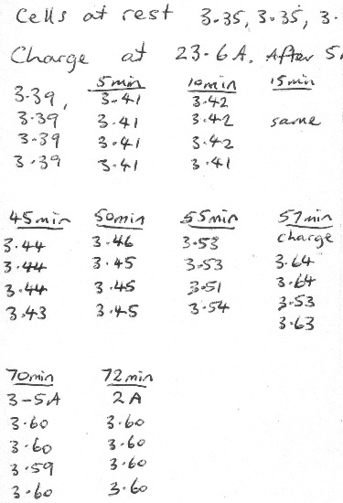 Gordon [GWatPE] has made an equalizer for 4 x Thundersky cells. Thanks heaps Gordon. I changed the AGM lead acid 12v for 4 cells x 90ah Thundersky Lithium in my EV. Cell voltage balancing is a significant problem with lithium batteries. Overvoltage and undervoltage of LFP cells can cause damage, or cells can just stop working, (even fire in other lithium chemistries). LFP are deemed to be fire safe, but still the voltage boundaries must be observed. I have seen individual cells in a battery pack with up to 0.5/0.6V variation between cells during charging. This is not good. When one or more cells have a higher voltage than the others, the chances of reaching an overvolt situation with these cells is greater. In my main pack I have to watch the end of every charge and manually switch of the charger when the high volt cells reach there maximum voltage. The Thundersky BMS is helpful by monitoring and signalling an alarm when overvolt occurs (I set to 4.1v/cell, max is 4.25v), but does not equalize the cells. The Thundersky BMS also has external alarm outputs which could be connected to automatically shut down the charger, but still does not address the problem of reduced overall capacity of the pack. While some cells are full, the others are not. I have tested Gordon's equalizer here and it works extremely well. It is connected to the battery cells only. I don't know exactly how it works, but it makes the cell voltages become equal. It seems to equalize the cells at all times. It has a high voltage warning LED, but the charger could not reach the high volt warning. It has a low volt warning at 12.4v (12.4v/4cells = 3.1v) and another low volt warning at 11.2v (11.2v/4cells = 2.8v). It is not like other BMS. It is not dependant on a charger. It does not have charge current bypass at a particular voltage on any cells. It does not burn off (wasted as heat) any power as other BMS units do. As already said I have seen 0.5/0.6v differences in these 4 cells while under charge. These recordings are when I first connected Gordon's cell equaliser to the battery and covers the first charge. 1) Using CTEK charger, soft start, amps ramp up over a few seconds to 23.8A. Cell 1 - 3.40v cell 2 - 3.41v cell 3 - 3.43V cell 4 - 3.41v 2) After a few minutes current still at 23.8A. Cell 1 - 3.42v cell 2 - 3.42v cell 3 - 3.42V cell 4 - 3.41v 3) 20 minutes later, charger at 23.8A Cell 1 - 3.43v cell 2 - 3.43v cell 3 - 3.43V cell 4 - 3.43v 4) As the cells were near full the voltage seperated some, the charger had gradually cut back the current to 1 amp. Cell 1 - 3.56v cell 2 - 3.83v cell 3 - 3.42V cell 4 - 3.59v 5) 1hr later, still charging 1 amp Cell 1 - 3.58v cell 2 - 3.80v cell 3 - 3.43V cell 4 - 3.60v 6) 2 hrs later, still charging 1 amp Cell 1 - 3.64v cell 2 - 3.72v cell 3 - 3.43V cell 4 - 3.61v 7) Charger was manually switched off for the night. The next morning the cell voltages were Cell 1 - 3.33v cell 2 - 3.34v cell 3 - 3.33V cell 4 - 3.33v 8) Charger switched on again, charge at 24A. After a few minutes Cell 1 - 3.43v cell 2 - 3.44v cell 3 - 3.43V cell 4 - 3.43v 9) Charger current automatically cutting back, charge at 6 amps Cell 1 - 3.66v cell 2 - 3.78v cell 3 - 3.50V cell 4 - 3.65v 10) Charger current automatically cut back to 0 amps. After some time the voltages are Cell 1 - 3.35v cell 2 - 3.35v cell 3 - 3.35V cell 4 - 3.35v This was just too good to be true, but no joke thats the numbers measured. The next was to see what happens under discharge. And then another recharge. I am tired of typing, I will try to copy my hand notes. Not quite exact but certainly fixes the problem of voltage extremes. Note in the first charge where Gordon's equalizer had only begun to equalize, the maximum difference of 0.41v. Note in the 2nd charge the maximum difference of 0.10v. It is now being considered for a short production run. It can be used on any number of cells. Simply overlap each unit by 1, 2, or 3 cells to match any number of cells in a pack. Edited too many times, hand notes! I win eventually. Trev @ drivebynature.com |