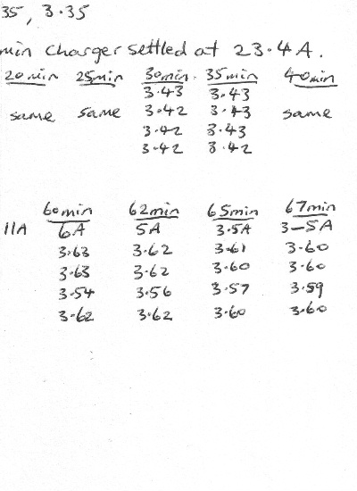 Gordon's Equalizer has been used daily now for 3 1/2 weeks. The batteries are charged at night and everytime I have checked in the morning, the cell voltages have been exactly the same or at most only 0.01 out. Here is the voltages of charging after a normal days discharge. I checked them again in the morning and the cell voltages were all exactly the same at 3.35v. The batch of new equlizers should arrive soon. They are smaller and only take 6mA or so instead of the 14mA or so for this prototype, and still have the same transfer capacity. Trev @ drivebynature.com |