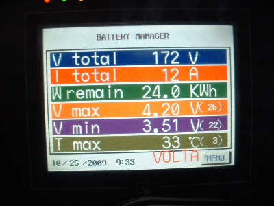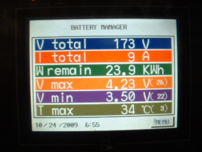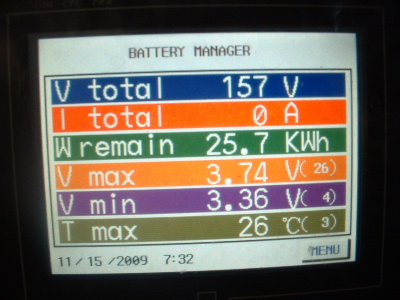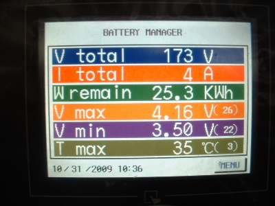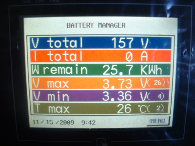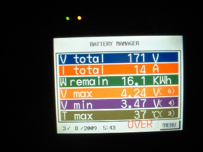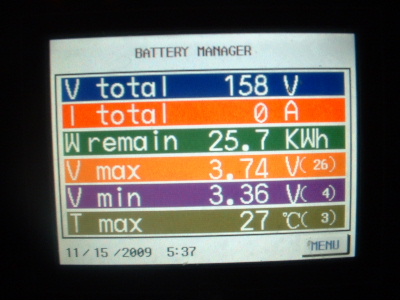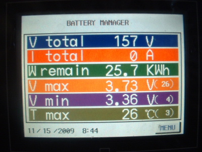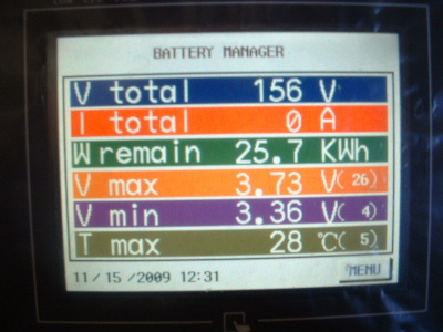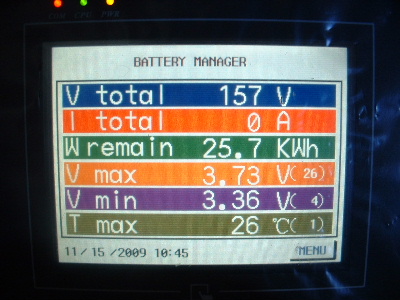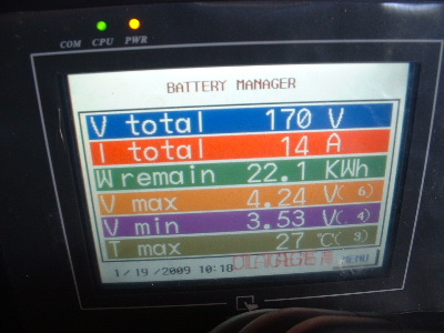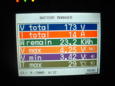 The equalizing issue is a big one. To be told that the Thundersky recommended BMS (Battery Management System) was the best there is, is simply not true. However, I do give a big thankyou to Thundersky for clarifying that this BMS does not equalize the cells. To cut back a charge current or switch off the charger (Thundersky Charger) altogether when a cell reaches its maximum voltage does not allow the full potential of these batteries. Don’t get me wrong, this BMS is a great Battery Monitoring System. It does have a lot to offer for a monitoring system, however the low and high voltage alarms are not consistant. With no equalizing, each cycle the cells become more and more out of balance. When I first fitted the TS-200ah cells the difference was around 0.3-0.4v between the highest and the lowest cell in the pack of 45 cells. Over time this difference has become more outstanding. At times, for some unknown reason they appear to be equalling. After a while I started to photograph the screen. The dates on the screens are wrong, but I think I have them in order. Here you can see the red writing at the bottom of the screen, sometimes but not at other times, which is over voltage alarm. I set this over voltage alarm to 4.1v. The charger was manually switched off whenever a high voltage was reached. Very annoying every morning keeping a check on the battery charging. The kWh reading is also wrong, don’t take any notice of that, I have not calibrated it properly yet. In each screen, the differences are 0.71v, and increased to 0.77v, then decreased 0.75v, 0.73v, 0.69v, 0.66v, but then started to increase again, 0.77v, and 0.83v. Trev @ drivebynature.com |