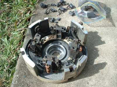 There were some of the old brushes that had stuck in the brush holder. In the pic above you can see at the top left the longest one. It had stuck and not worn down as the others. There was a bit a variation between the brush lengths. But of course it was when the brush springs reached their limit when all stopped. I had not noticed any reduction in power the few Km's before it stopped. Only metres before, it missed a beat.