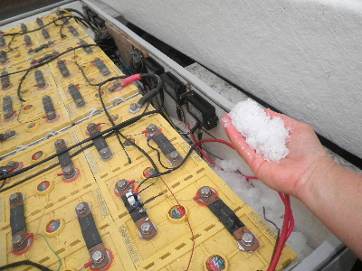 The batteries got quite hot, 70 degrees Celsius. We were about 20km from Childers. We stopped and pulled the tray off to allow it to cool some. Seemed to take forever, only about half an hour, there was a dark storm cloud coming over head, we decided to cover the batteries and move off. Just as we were loading the stuff on the tray, and strapping down, the rain started. Got in to Childers, removed the tray, put in water around the batteries, twice, draining out hot water. This was much quicker, but wanting to keep going, put in 4 kg of ice, put the tray back on and got going again.