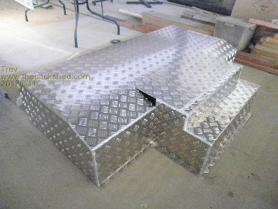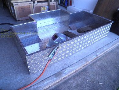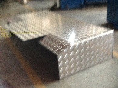 Here are some pictures of the new alloy battery box. It has been changed to alloy so that the box can still be sealed, keeping out dust, water and mud, but is a massive heat sink, letting out any heat generated. So far the highest temperature I have seen is 26 degrees C. The box is made from 3mm alloy checker plate. The hydraulic pan brake I used did not have a deep throat so some sections had to be bent by hand with steel clamped near the bend lines. The box was made up in 4 sections and TIG welded together. Apologies for the poor quality pictures.