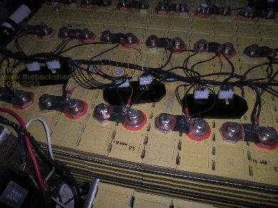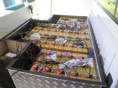 The Zivan chargers were used to charge the cell and then a bundle of 3.7v chargers moved across the pack bringing each cell up to 3.7v. While they were charging, I set about connecting the BMS (monitoring) wires. Some teething problems with the BMS. Some wire connections mucked the whole system and took me ages to trace through it all and get it working. The BMS wires were wrapped up with poly spiral tubing to make it all neat.