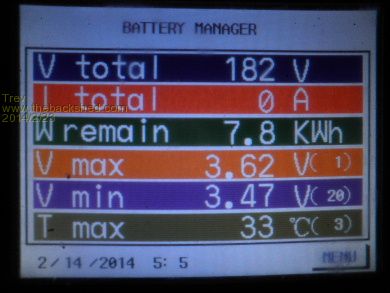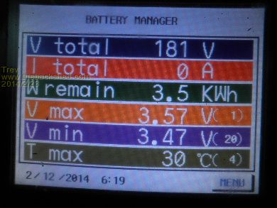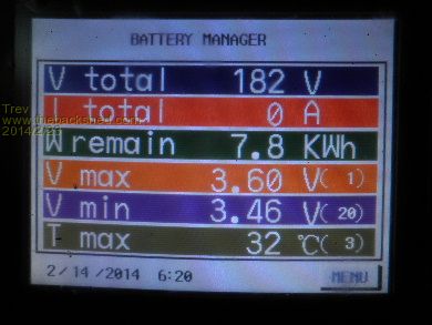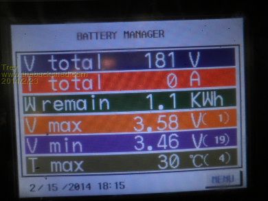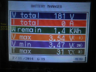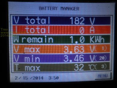 The next day, 15/2/14, at peak pack voltage 3.50am it was 3.63v -3.46v (170mv). By 6.15pm (18.15 on the screen) Relativities had brought the voltages back to 3.58v -3.46v (120mv). As you can see, the large pack does not balance very quick. The number in brackets to the right of the cell voltage is the cell number, so cell 1 is the highest and cell 20/19 is the lowest. The power from cell 1 has to go through several Relativities to get to cell 19 or 20. Relativities is holding them though, every morning the cells have been around the 170mv different. They are not separating any more.