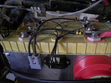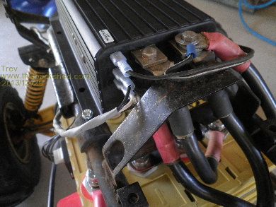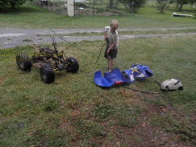 The battery voltage was 3.32v per cell when we left to go to my sister's place and was still 3.32v per cell when we got home. It will be interesting to see just how long it will run for. We then set about getting all the covers back in place. Dale has a very good memory of what goes where and with what bolts. Some new bracketing made along the way and other improvising to hold the covers in place better than they were before. The speed controller top heat sink had to be cut a little on the top back corner to fit under the front cover. The rear cover, left mud guard, had to have a very small piece cut from it to fit around the motor, and the black foot guard had some cut from it also to fit around the motor. Dale loves the hands on stuff. Trev @ drivebynature.com |