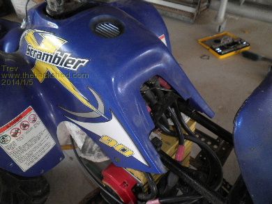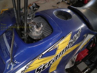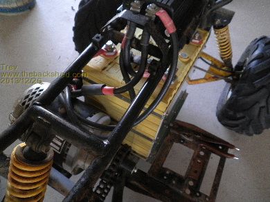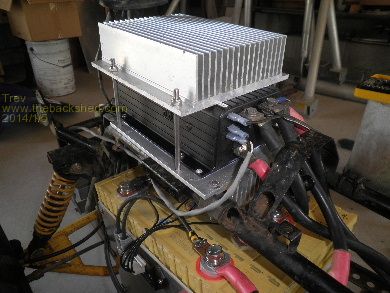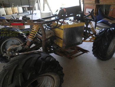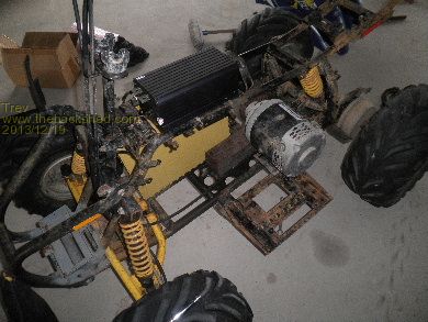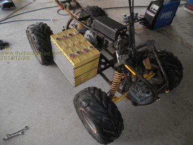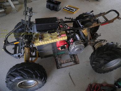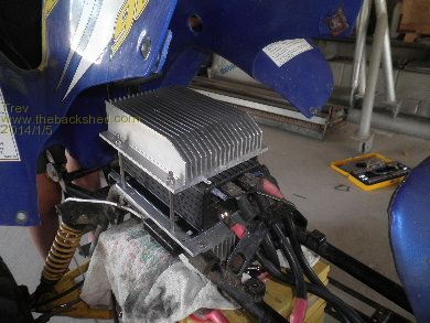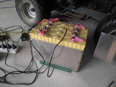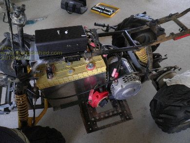 In between work, extended family, and other activities, we continue our little project. Hope everyone had a great Christmas. First up was to get the motor mounted. The motor had to sit out a little into the foot rest area so the sprockets and chain lined up. The front mount was quite simple. Just welded a piece of box tube across the 4 wheeler frame for motor to sit on, bolt to. The back one had to be cut to mould into the 4 wheeler frame on an angle. All good, painted and bolted in the motor. Then it was on to the battery pack mounting. This was quite simple. The frame had to be leveled off some and fitted with a flat bed to sit the battery pack on. The flat galvanised sheet was welded to the 4 wheeler frame. The angle at the bottom of the battery pack, screwed to the side alloy strapping plates, simply bolt through the foot rest frame. With that sorted, the cells were then set up for charging and balancing. All cells connected in parallel and charged with 5 x 3.7v chargers, giving 20A charge rate. These cells are 260ah. The speed controller was bolted to the 4 wheeler frame where the fuel tank used to be. To start with we had the terminals facing forward, but just couldn't get the cables to work neat enough. I am using old cables that came out of the EV Hilux. Ended up removing an old fuel tank bracket, and turning the speed controller so the terminal face backward. The problem with terminals facing backwards was that the seat has to mount under the steel strap there on the frame. The cables had to be kept back from that seat bracket, but worked so much better. The seat still works. No new cables were made. All the high power cables are connected. The dual battery switch is used as precharge through a resister on "number one leg". On "both leg" and "number 2 leg" the high power can flow. The switch is rated for 300amps continuous and 400amp max intermittent. It should handle it. The speed controller is 400amp, but should not need that much to get the 4 wheeler rolling. Trev @ drivebynature.com |