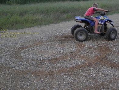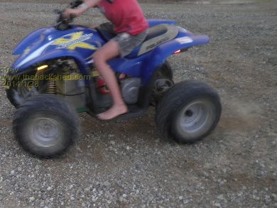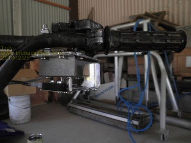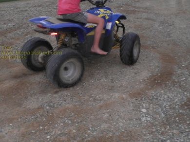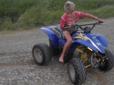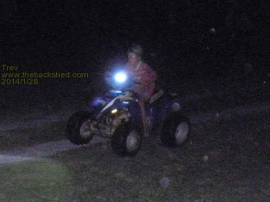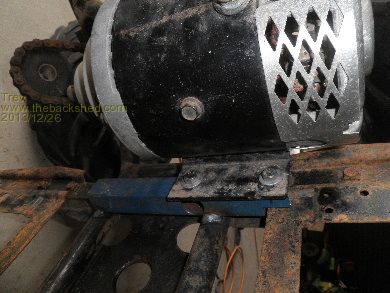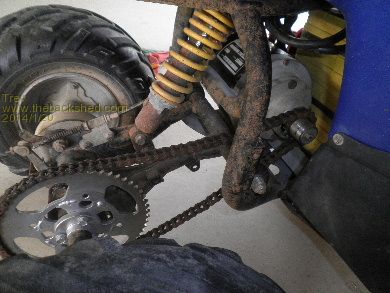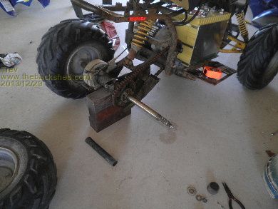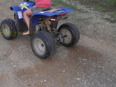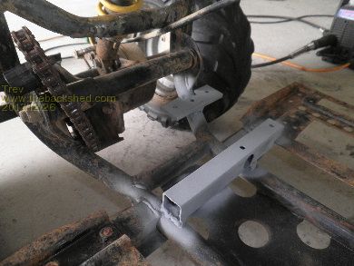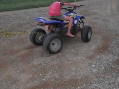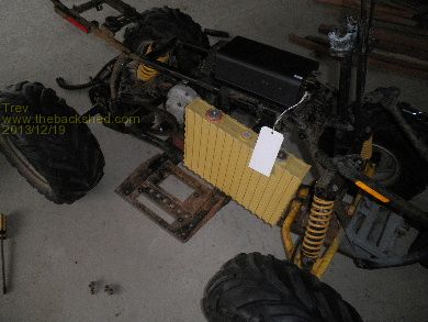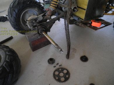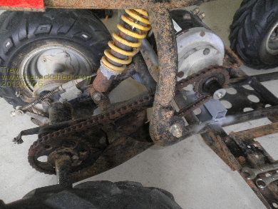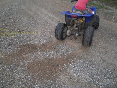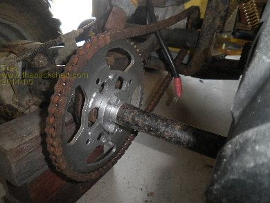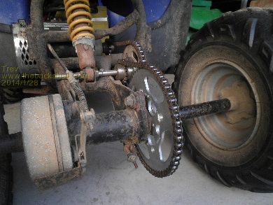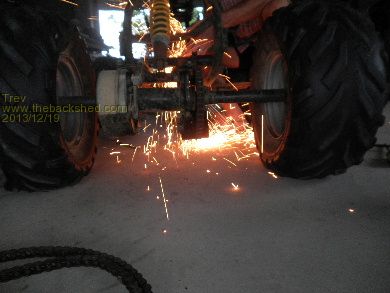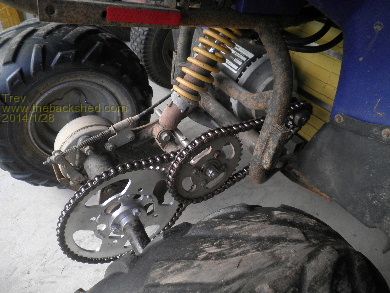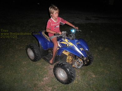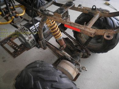 We had this old bike lying under a tree for some time. Looking and thinking, we decided to strip the wheels (Dale wants another trailer to tow behind the electric 4 wheeler) and the sprockets for adding to Dale's 4 Wheeler. Then it was to thinking how we can make the sprockets work. This was a very tricky little exercise, and after testing different ideas, we came up with an idea that worked. A bit of machining, to hold it all together and bolt it onto the rear swing arm. We finished this last Wednesday night and took it out for a test run. The gear ratio is now 13 teeth on the front to 37 teeth and then 14 teeth to 56 teeth. That's 11.38:1 ratio. We have cut the top speed quite a bit, but increased the torque on the back wheels and now has no problem climbing up the hills. Acceleration is great! Dale has been riding it around quite a lot. Today we take it out for some pictures of spinning the back wheels. Trev @ drivebynature.com |