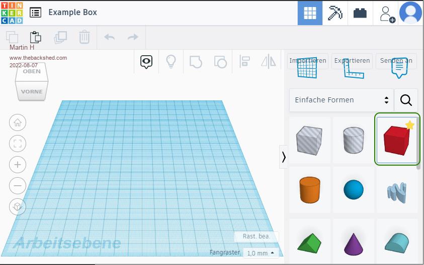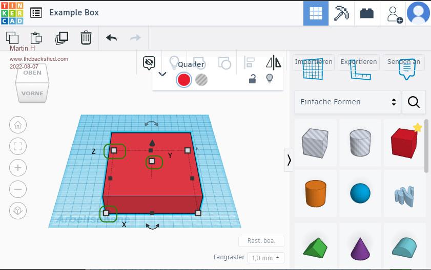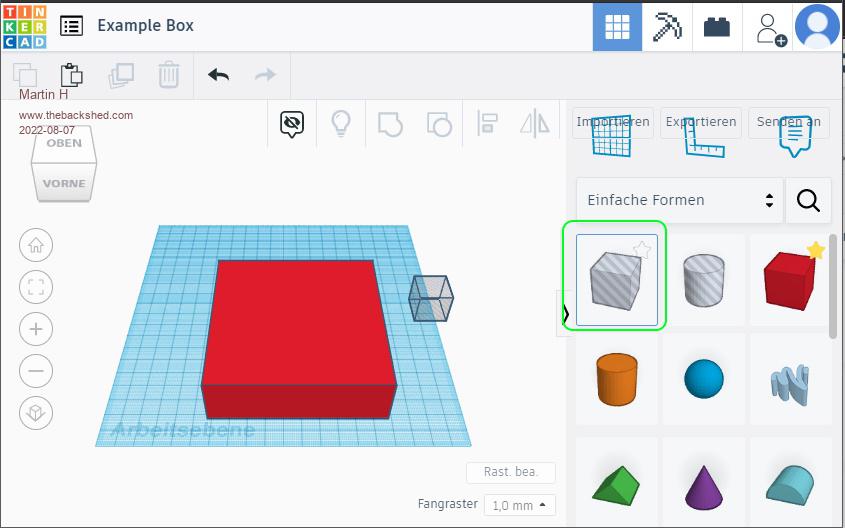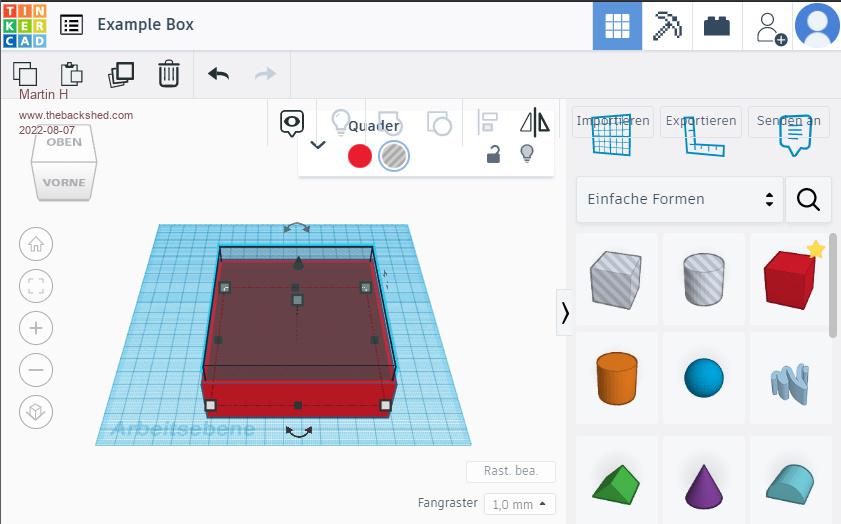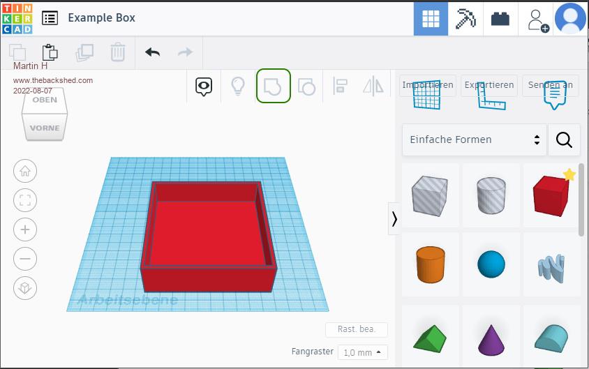 simple Example Box in Tinkercad Use the Box Shape ![]() Place and resize it as you whish ![]() select the shape to cut ![]() Resize it and place it inside the Box ![]() merge both Shapes to one ![]() there is the Box. Which can be downloaded as .obj, .stl, .gbl or .svg File imho. for simple Shapes an easy way to construct. Edited 2022-08-07 20:31 by Martin H. 'no comment |