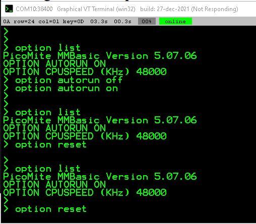 Nope, OPTION RESET crashes the PM in TT as well, so I am unable to reset to defaults. TT's menus etc still work, but you just can't do anything until you press reset on the PM module, at which point we're back to where we were before. I will try to manually reset the CPUSPEED back to 133MHz. ![]() If that does not work, I will reflash the firmware and try again, but WITHOUT setting the CPU speed down to 48MHz. I'll keep the thread updated. EDIT: Seems to be something to do with setting the CPUSPEED to 48MHz. Issued the command OPTION CPUSPEED 133000, PM then rebooted as expected. OPTION RESET then worked. NEW, then AUTOSAVE the code back to it again. OPTION AUTORUN ON, and eveything is working as expected. ![]() Not sure if this is a bug or I was just unlucky or something. Comments welcome. Edited 2023-03-05 12:09 by Grogster Smoke makes things work. When the smoke gets out, it stops! |