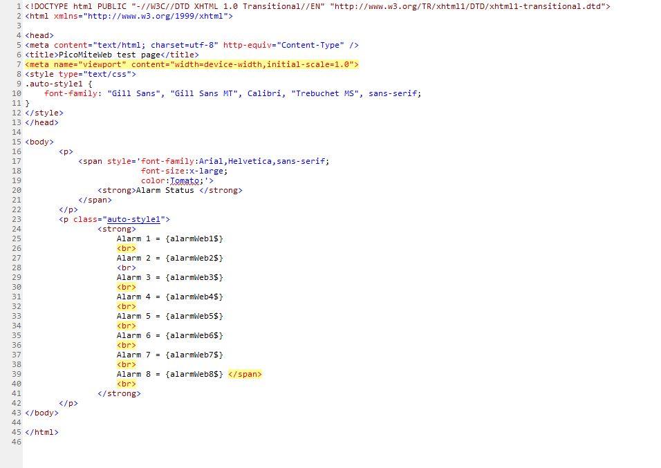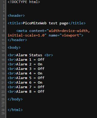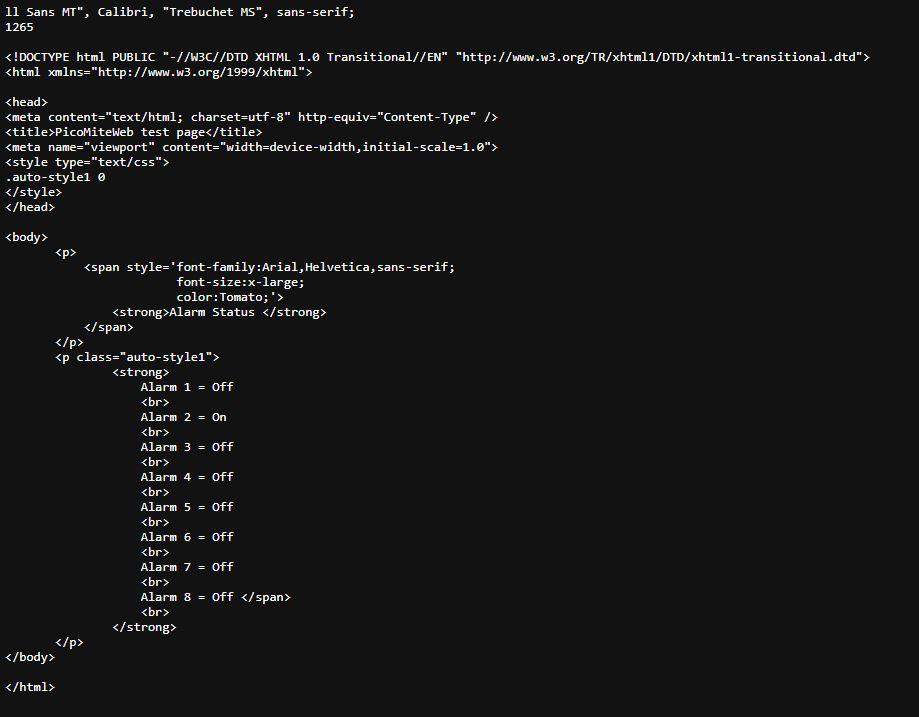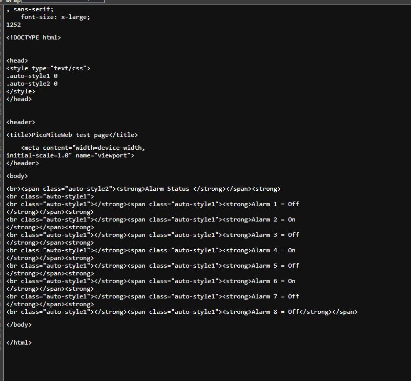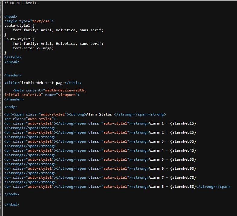 @kaptinvimes A few comments (not a html expert at all but W3Schools.com is your friend) You should have a <html> tag immediately after the <!DOCTYPE html> <meta ... > and <title> should be in the <head> tag, not <header> Your <meta ... tag> should have the name content rather than the other way round you have - see code below There is actually no need for a <header> tag Repetitively invoking <span> and embedding the class object is a memory consuming process and while it works(sort off) it is a very inefficient method - see the suggested thinned down version below. I find that indenting clears up the structure and makes the html much easier to read and debug, remembering that tabs, new lines in the text are ignored by your browser. <!DOCTYPE html> <html> <head> <style type="text/css"> .auto-style1 { font-family: Arial, Helvetica, sans-serif; } .auto-style2 { font-family: Arial, Helvetica, sans-serif; font-size: x-large; } </style> <title>PicoMiteWeb test page</title> <meta name="viewport" content="width=device-width,initial-scale=1.0"> </head> <header> <!-- stuff in here moved to <head> as per W3School --> </header> <body> <p> <span class="auto-style2"> <strong>Alarm Status </strong> </span> </p> <p> <span class="auto-style1"> <strong> Alarm 1 = {alarmWeb1$} <br> Alarm 2 = {alarmWeb2$} <br> Alarm 3 = {alarmWeb3$} <br> Alarm 4 = {alarmWeb4$} <br> Alarm 5 = {alarmWeb5$} <br> Alarm 6 = {alarmWeb6$} <br> Alarm 7 = {alarmWeb7$} <br> Alarm 8 = {alarmWeb8$} <br> </strong> </span> </p> </body> </html> As far as using with PicoWEB, I don't have one yet so can not test in that environment. Hope this helps, Regards, Doug. ... almost all of the Maximites, the MicromMites, the MM Extremes, the ArmMites, the PicoMite and loving it! |