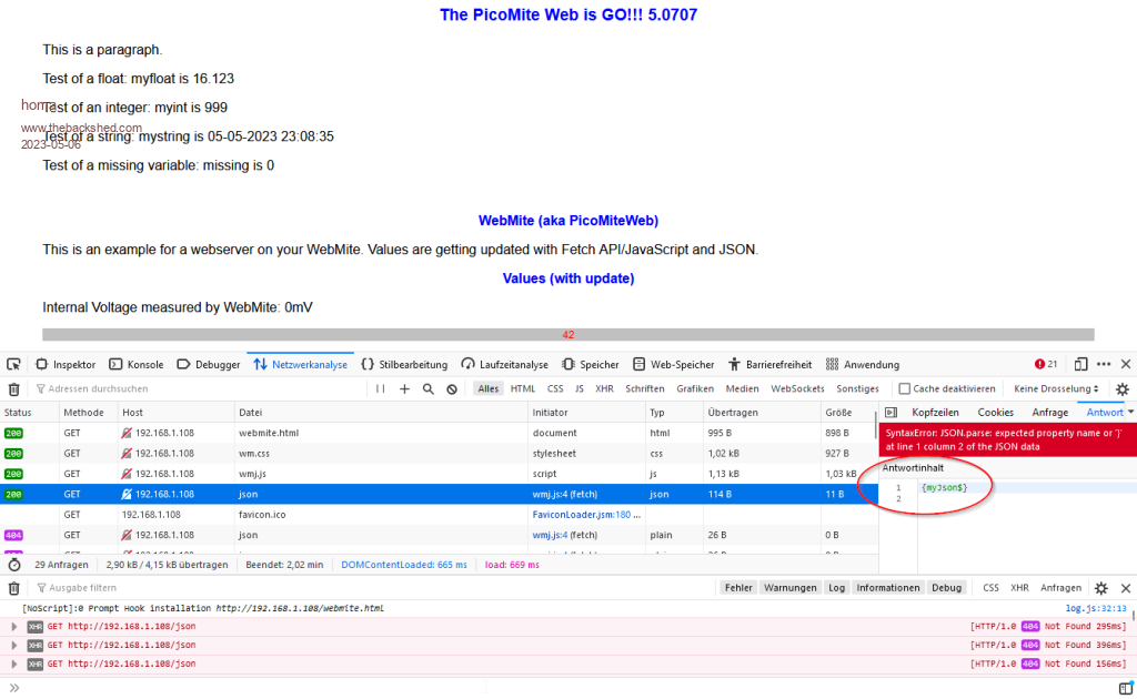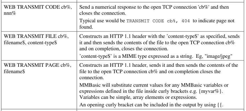 Hi Peter, Unfortunately, your idea doesn't work. The variables in the file are only set with the WEB TRANSMIT PAGE command. However, the content-type$ cannot be specified there. With the WEB TRANSMIT FILE command, it's the other way round. No variables in the file, but the required content-type$ = "application/json" can be set for it! The screenshot shows very clearly how the different content types can be loaded. CSS, JavaScript, but unfortunately the variable in the file "json.data" remains unfilled and the name "myJson$" appears in the response content (Antwortinhalt). The simplest solution should be to be able to specify the desired content-type$ in the WEB TRANSMIT PAGE command and not to use the default for a website. I would appreciate your help here! Thanks again for the release of the WebMite version! Matthias ![]() ![]() Edited 2023-05-06 07:33 by homa |