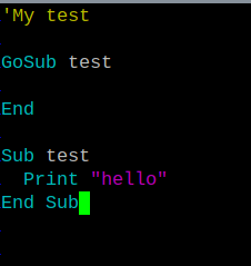 I get this weird error "Error : Invalid character:" when I use GOSUB Test, but if I just use the word test and leave out GOSUB, it executes the subroutine correctly????