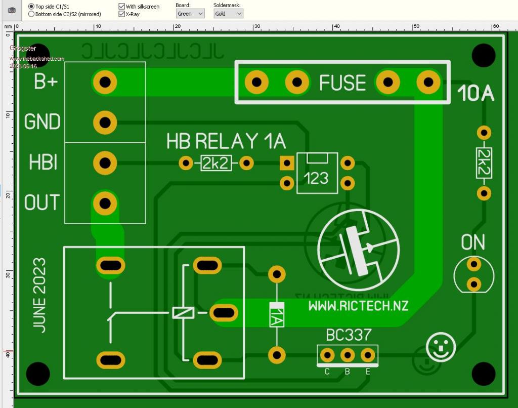 what is the relay's coil resistance? when turned on, the BC337 will see 0.6v across collector to emitter and so will at the least get warm. google says that a headlight relay's coil typically draws 150-200mA. i would suggest either: 1. cut the track running to pin 4 of the optocoupler and connect pin 4 to B+ via a resistor of perhaps 1k5. this will ensure that the BC337 is fully saturated when on. or: 2. leave out the optocoupler completely and bridge between pins 1 and 3 of the optocoupler's footprint - this would mean HBI is connected via the existing 2k2 resistor to the base of the BC337. btw, did you intend that the LED be permanently illuminated? as shown it will permanently draw a few mA from the battery and create a (red) glow from wherever the PCB is mounted. the current draw is likely far less than existing parasitic losses within the car, but the glowing LED may be an annoyance. cheers, rob :-) |