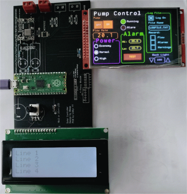 Just a tease. I'm not close to hooking up any relays or inputs: 20x4 LCD with ILI9488 running Geoff's guidemo.bas altered for 480x320 LCD.
