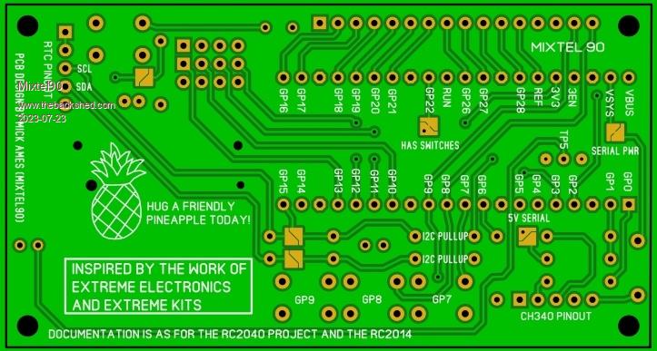 Based on the RP2040 circuit. Facilities identical except: PCB can accept either surface mount or through hole Pico. For resistors you can use through-hole, or there are size R1206 pads for SMD. 5V supply fron USB-C (VSYS - original used VBUS) or serial terminal (via a diode). The latter supply can be disconnected via a blob link. GPIO connector extended to include GP8 (BUT) and GP9 (DUMP) so that these will be accessible for PS/2 keyboard if a PicoMite is fitted. The serial terminal pins have been rearranged. If you fit a female socket then a CH340 can be plugged straight in. microSD card socket changed to standard SD for easier soldering. The board has been designed to take the usual 9-pin Hirose socket (from RS) or a cheaper 11-pin Chinese one from ebay, but the latter has not been verified yet. Supply filter added for SDcard. Capacitor added on reet button. Red LED added for DSK (via TP5). If this is fitted it replaces the green one on the Pico. GP14/GP15 were allocated to a PC speaker. Added 100R resistors in series with each to protect the Pico's outputs. Audio socket now expanded to same connections as tiny RTC module,(for a PicoMite) using GP14/GP15 as I2C. 3V3 has to be enabled via a solder blob for safety. 100R resistors can be linked out via solder blobs and pullups added for I2C. Has a large, friendly pineapple on the back. (Because I can. :) ) One of the main reasons for these mods is to make the PCB multi-purpose. If you install a standard PicoMite it can be used as a stand-alone module with SD card, 11 GPIO (incluuding the ADC ports), serial terminal, RTC and four GP pins that can be used as links or IO. PCB is 90mm x 48mm so it's reasonably compact.Because of the arrangement it would probably be very easy to make a couple of stacking PCBs, one with VGA (all the signals are on the GPIO connector) and the other with IO expansion via I2C and, possibly, a second PicoMite.. RC2040 Gerber.zip Edited 2023-07-23 00:24 by Mixtel90 Mick Zilog Inside! nascom.info for Nascom & Gemini Preliminary MMBasic docs & my PCB designs |