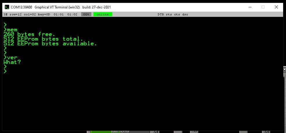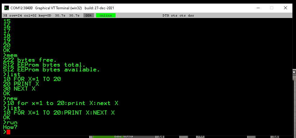 how well (or badly) would TinyBasic run on an Arduino NANO board, ie a 328p? that would give you serial over USB for free, 32k of flash, and a whole load more I/O pins. useful when paired up with MMB4Linux or MMB4Win as an 'intelligent peripheral'. cheers, rob :-) |