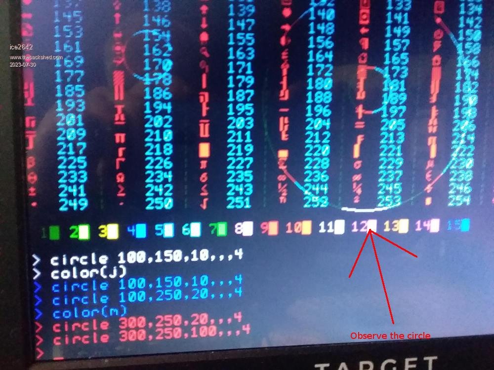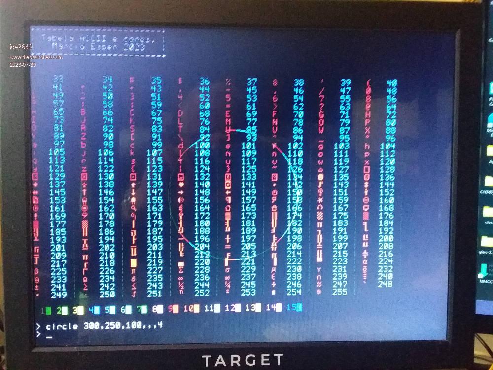 Hello, In the manual say the mode 1 monochrome and mode 2 color, but here mode 1 can made 16 colors. It is a problem in manual or in the picomite vga? I think it is cool, but have some limitations using color in mode 1. But it is unstable, for example if you use in command prompt list, all turn white. But mantain with some other prompt commands, like ? mm.info(version) ![]() ![]() The code for reproduce it in other boards. All is running on PcoMite VGA V5.0707 Cls Print "+-----------------------+" Print "| Tabela ASCII e cores. |" Print "| Marcio Esper 2023 |" Print "+-----------------------+" Dim r = RGB(myrtle) Dim g = RGB(green) Dim y = RGB(yellow) Dim j = RGB(cobalt) Dim f = RGB(cerulean) Dim h = RGB(cyan) Dim k = RGB(midgreen) Dim l = RGB(lilac) Dim m = RGB(red) Dim n = RGB(rust) Dim o = RGB(white) Dim p = RGB(fuchsia) Dim q = RGB(brown) Dim s = RGB(magenta) Dim t = RGB(blue) For u = 33 To 255 If u Mod 8 = 1 Then Print Colour (n):Print Chr$(u)" ";:Colour (h) If u < 100 Then Print " "; Print u;:Colour (r):Print " | "; Next Print :Print Colour (r):Print 01 Chr$(219); Colour (g):Print 02 Chr$(219); Colour (y):Print 03 Chr$(219); Colour (j):Print 04 Chr$(219); Colour (f):Print 05 Chr$(219); Colour (h):Print 06 Chr$(219); Colour (k):Print 07 Chr$(219); Colour (l):Print 08 Chr$(219); Colour (m):Print 09 Chr$(219); Colour (n):Print 10 Chr$(219); Colour (o):Print 11 Chr$(219); Colour (p):Print 12 Chr$(219); Colour (q):Print 13 Chr$(219); Colour (s):Print 14 Chr$(219); Colour (t):Print 15 Chr$(219); Print :Print Best regards, MMBasic 5.0707 on PicoMite VGA |