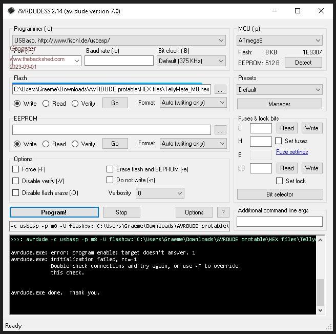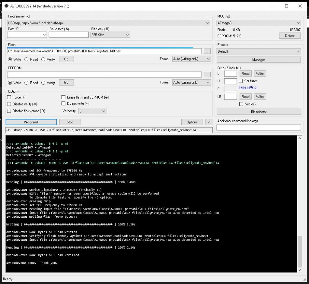 Owwwww - "Detected 1e9307 = Atmega8".... Lets see if I can program it.... YAY!!! ![]() ...and I have discovered that you DO have to have the 16MHz osc in place for the chip to even be detectable at all. Just tried to do a 2nd mega8 chip without the osc, and no talkie. Put the crystal and two caps back again, and talkie talkie talkie! But progress! I will now program the remaining four chips and store them labelled as programmed with the TellyMate firmware. Edited 2023-09-02 10:28 by Grogster Smoke makes things work. When the smoke gets out, it stops! |